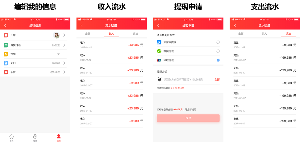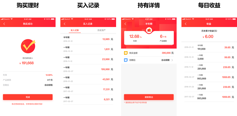 3、理财详情页面(购买理财、买入记录、持有详情、每日收益等情况)